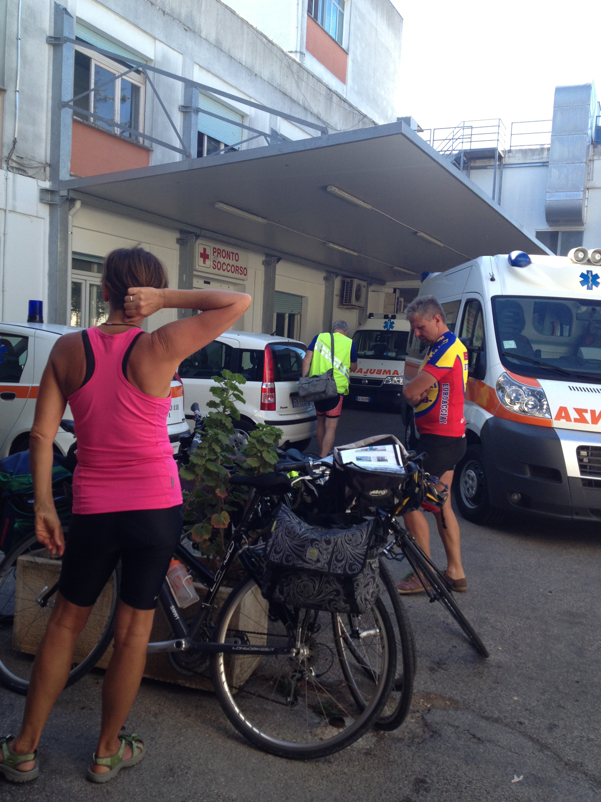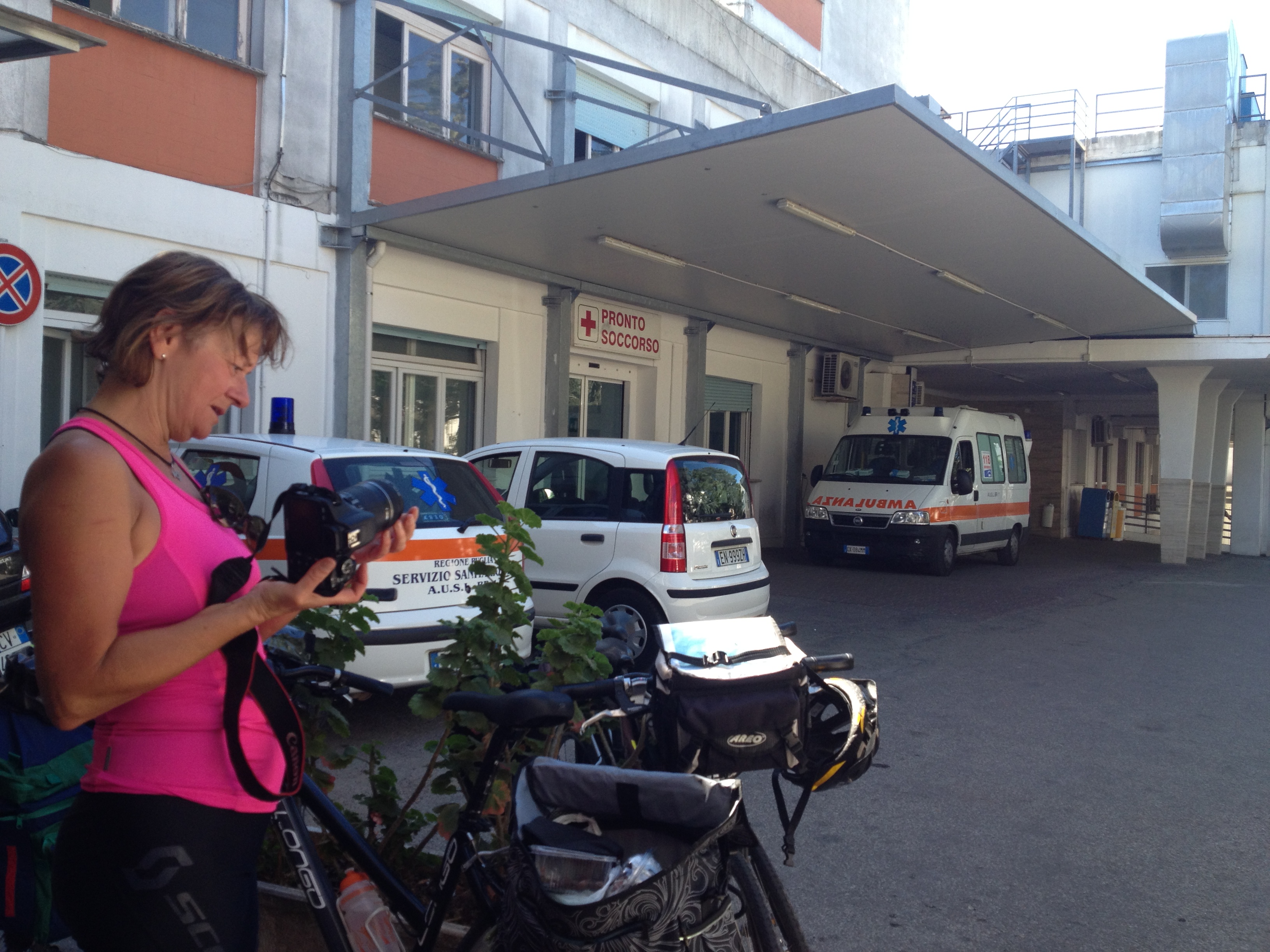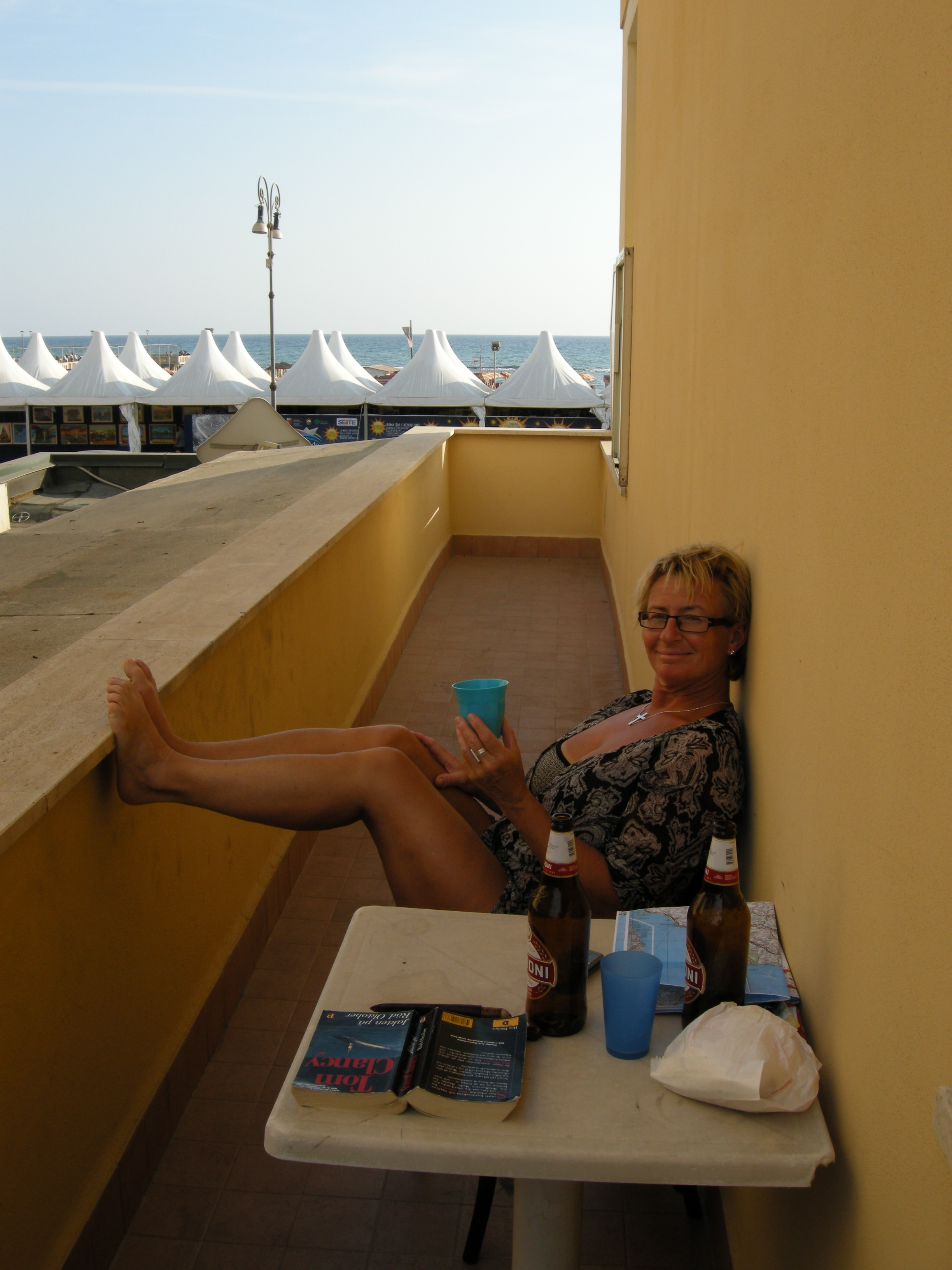 Resan gick ner till Rom och flygplatsen Fiumicino i slutet av august 2009. Efter lite övervägande så beslöt vi att ta med våra egna cyklar i stället för att hyra i Italien. Allt flöt på tills det var dags att plocka ut specialbagaget i Rom. Där fanns inte några cyklar! Efter två timmars väntan så förstod vi att det bara var att anmäla våra cyklar saknad. Flygbolaget skulle meddela oss när cyklarna var upphittad igen. Jag trodde inte det var sant. Hela vår resa gick ut på att cykla och där stod vi nu utan transportmedel. Det var bara att ta lokalbussen ut mot havet till Lido di Ostia där vi tog in på hotell. Sommaren hade ännu inte släppt taget om Italien så värmen låg fortfarande kvar. Ett dopp i havet var nu underbart skönt. Dagen tillbringades i en solstol på stranden eftersom vi inte fick någon återkoppling från flygbolaget. Vi kontaktade dom även själv genom oändligt många telefonsamtal, men utan resultat.