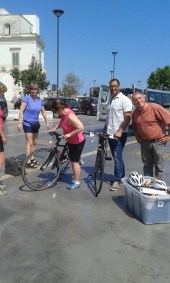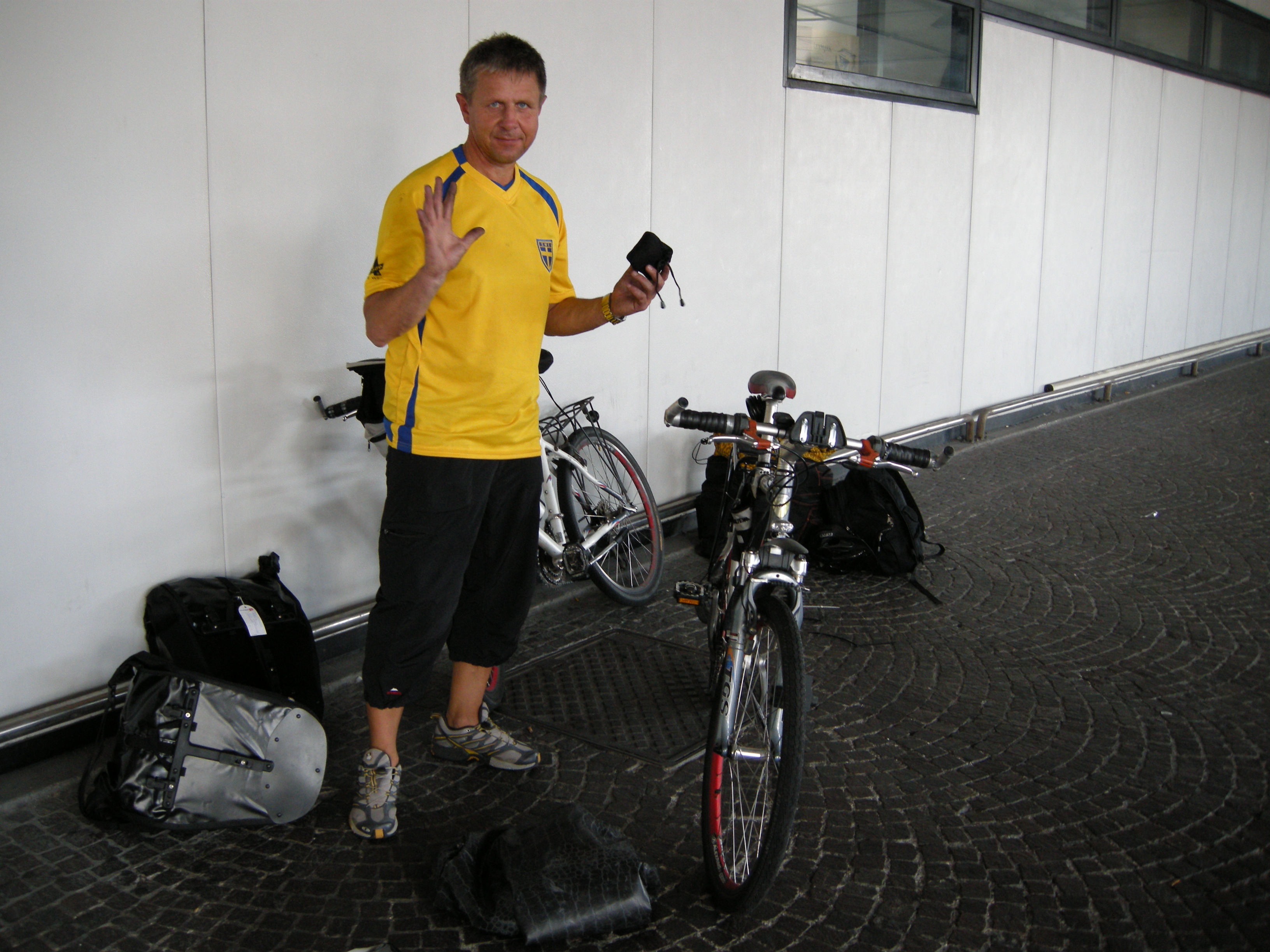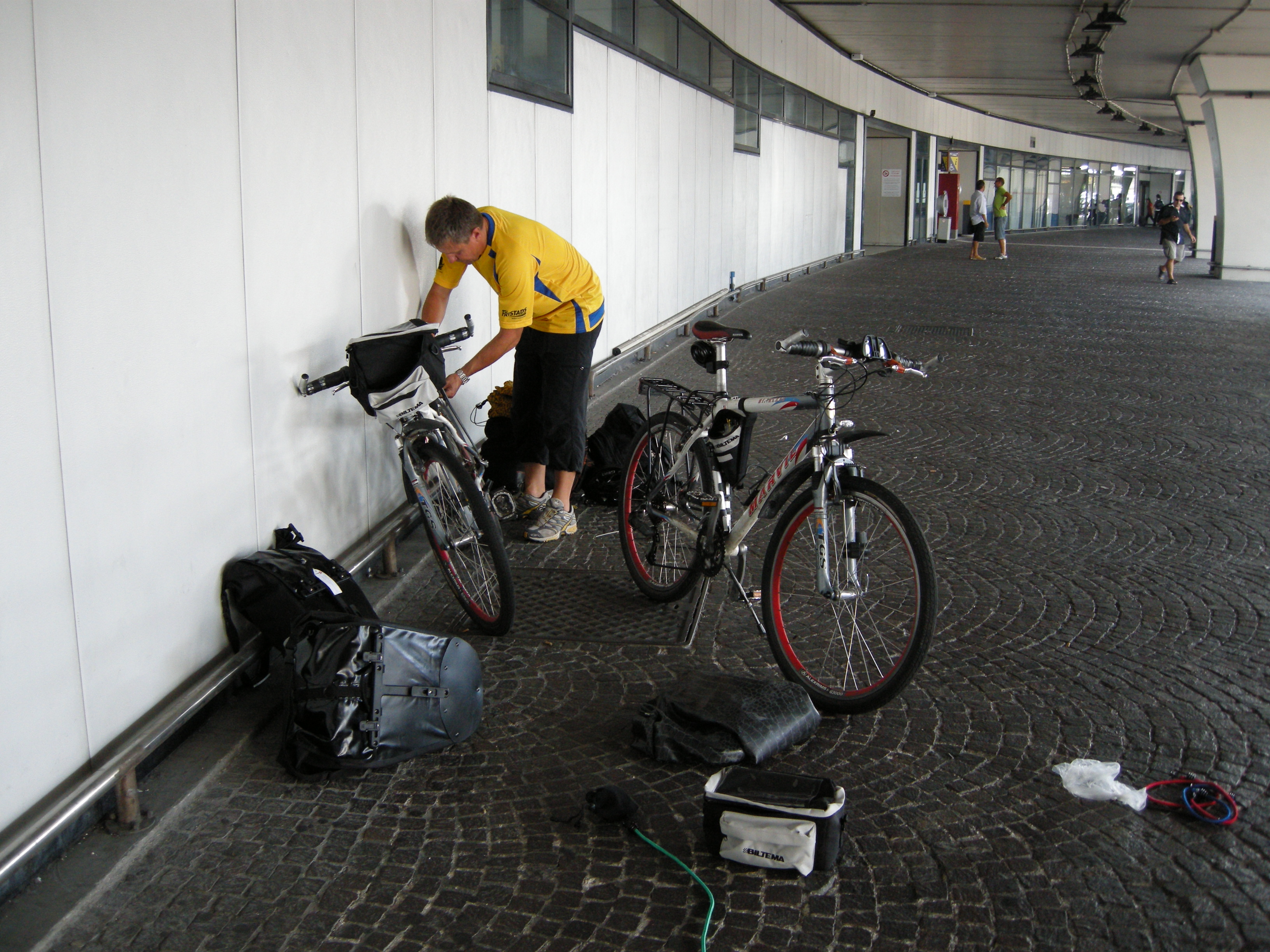 Efter två nätter i Ostia åkte vi tillbaka till flygplatsen trots att vi inte fått något besked. Det visade sig att vi gjorde rätt, där fanns dom. Det blev en otrolig lättnad! Utanför flygplatsen monterade vi ihop våra cyklar med trampor, styret och vi pumpade däcken. Allt såg helt ok ut.