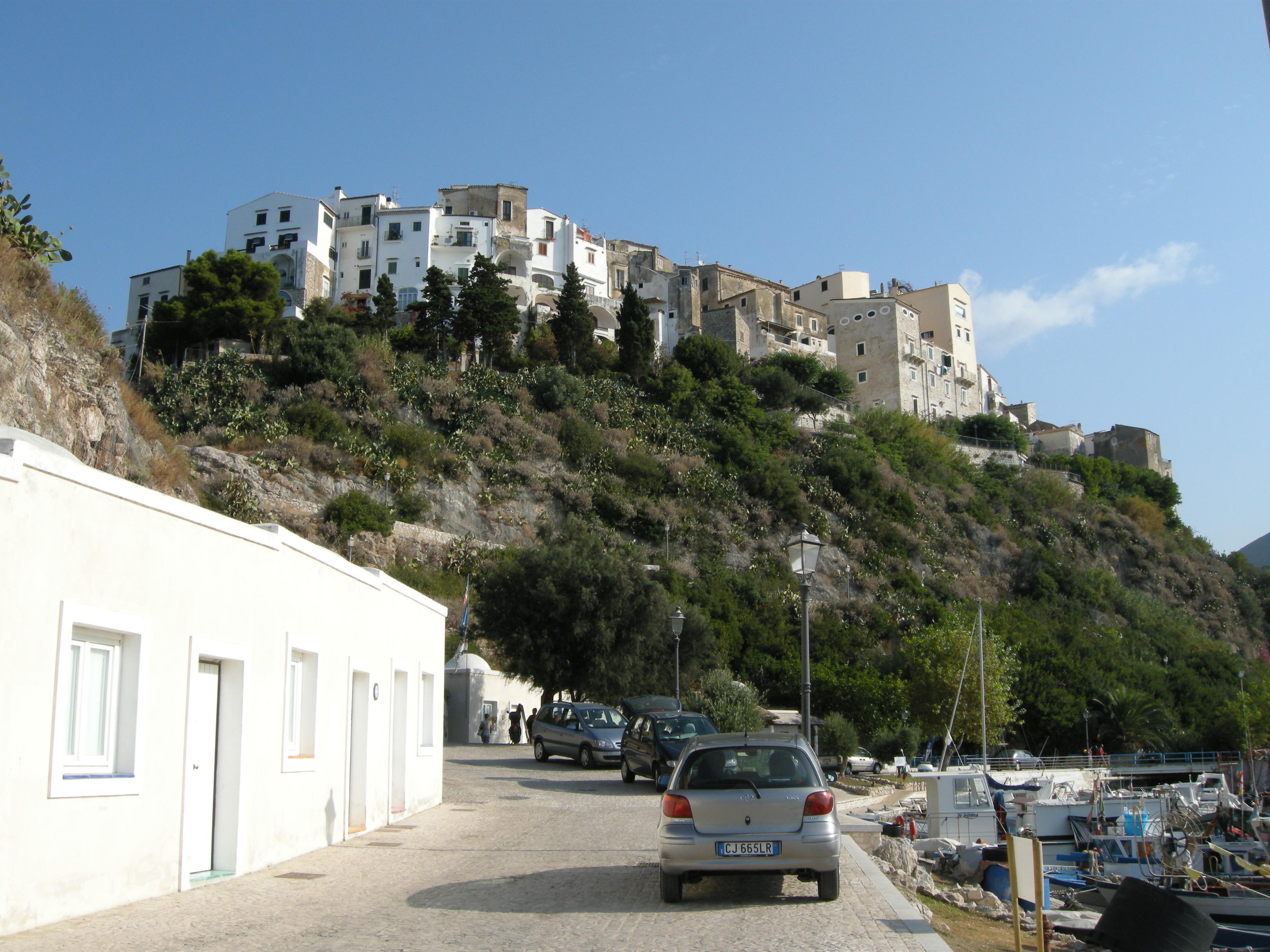 12 september, nu börjar benen ta stryk efter alla mil och uppförsbackar. Idag laddade vi med egen inköpt frukost eftersom det väntas ett nytt krävande pass. Förhoppningsvis kanske det går en båt över till Sapri från Marina di Camerota så att vi får vila denna dag. Tyvärr så gick inte vår önskan i uppfyllelse utan det var bara att börja trampa uppför vägen mot Sapri. Kan erkänna att jag tidigt fick hoppa av för att gå. Nu är jag både fysiskt och mentalt trött när jag ser dessa vägar som slingrar sig uppför. Det här passet var det värsta jag hittills varit med om, j..la backar. I tre timmar var det bara uppför men tur att det var vinodlingar efter vägen så att jag kunde nypa av en vindruva lite då och då. När vi kom fram till byn San Giovanni a Piro så började nedförsbacken mot havet och vi såg staden Sapri ut efter kusten. Nu gäller det att hålla tungan rätt i munnen. Att åka nedför på serpentinvägar är inte heller lätt. Övernatta i byn Scario, två mil från Sapri. I Scario var det underhållning nere vid hamnen på kvällen, en känd italiensk smörsångare. Familjer med vänner samlas och njuter i den ljumma havsvinden.