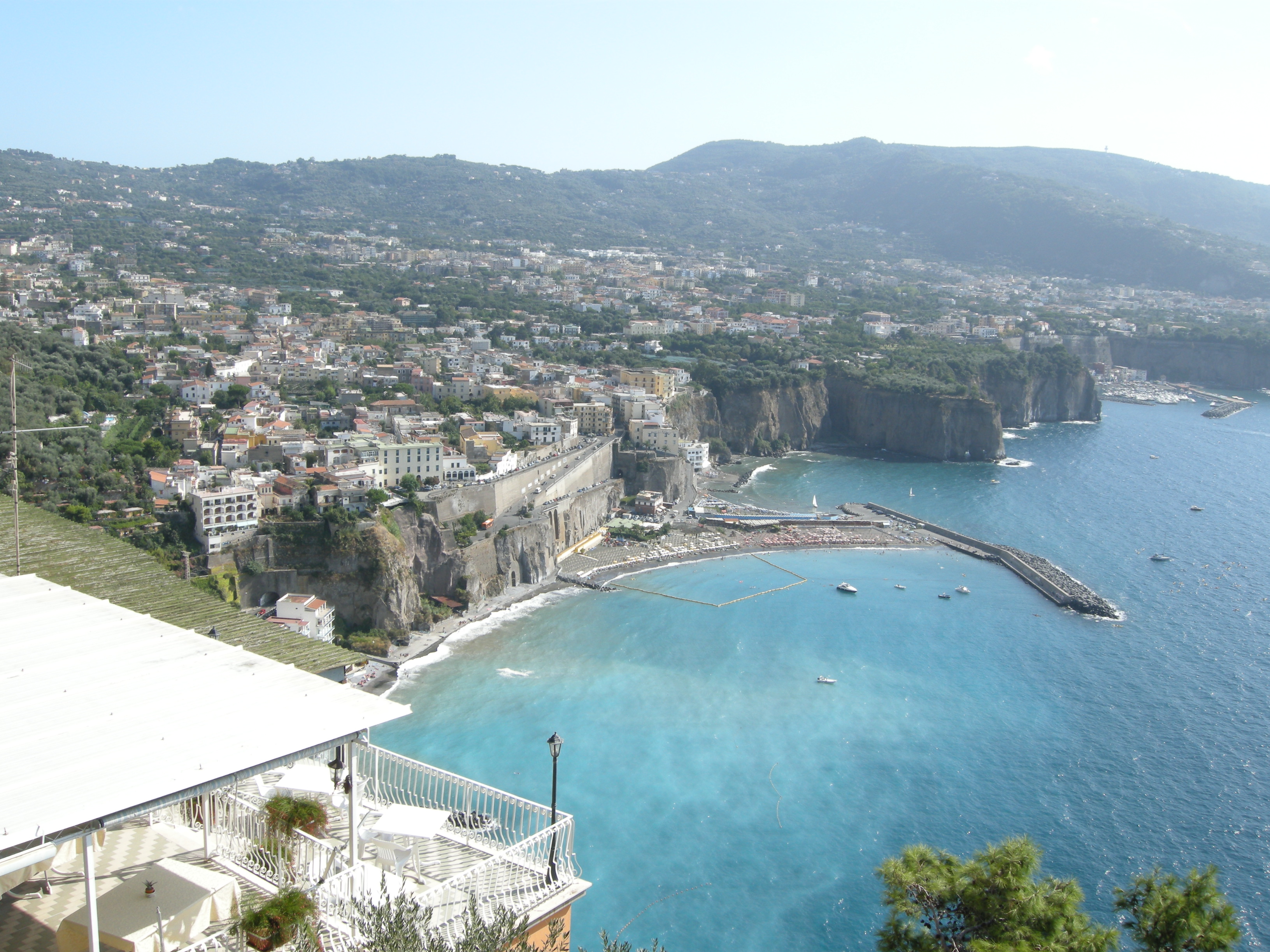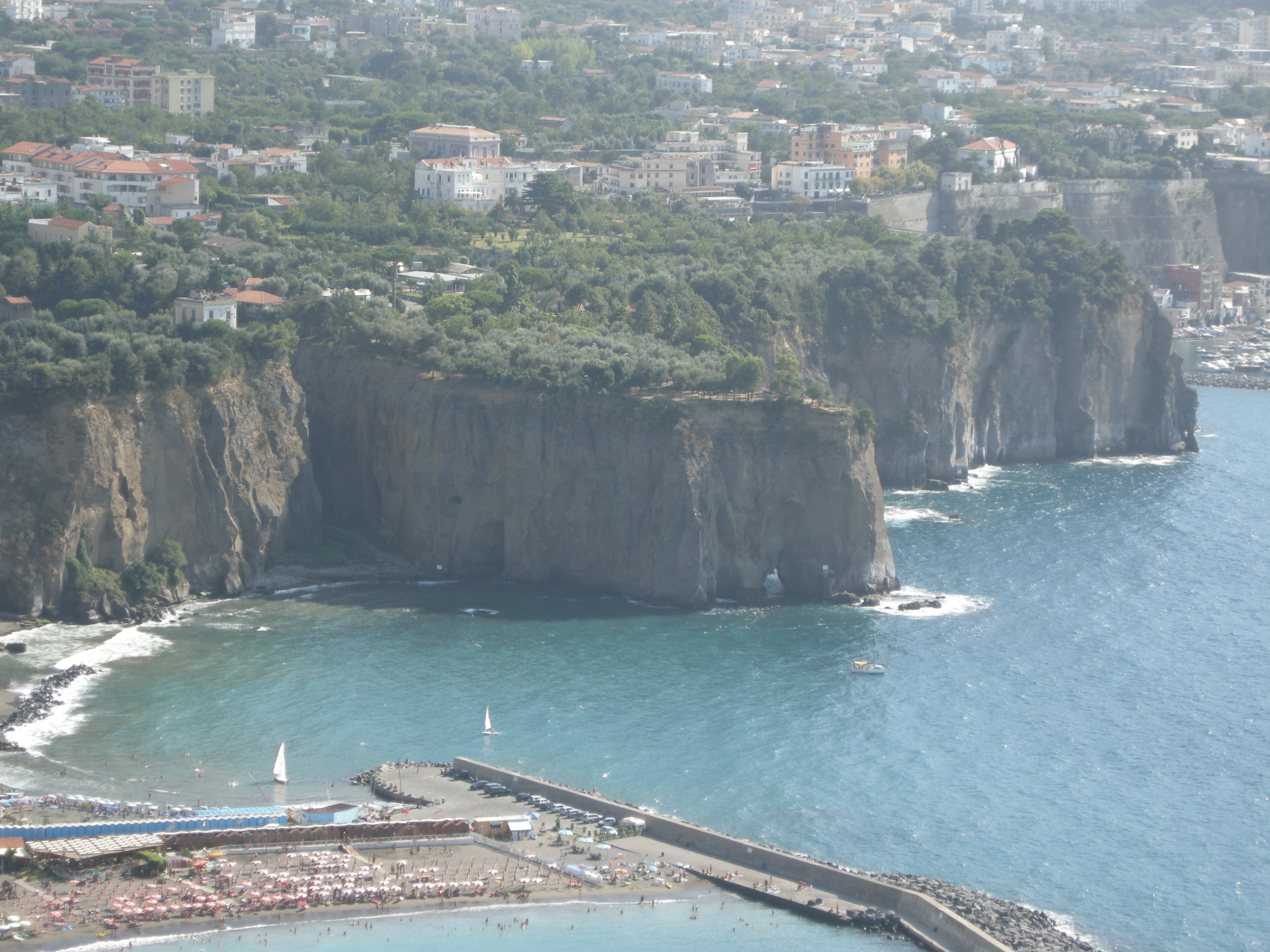 Efter Pompei fortsatte vi mot Sorrento. Strax efter Castellammare börjar stigningen upp efter kusten. Vi tar väg SS145 som fortsätter upp mot Sorrento. Reflexvästarna åkte på eftersom det var långa tunnlar vissa sträckor. Det gäller att hålla i styret ordentligt inne i tunnlarna eftersom det ibland är trångt och det blir sådant sug när turistbussarna åker förbi. När vi kom upp på krönet och såg hela Sorrento med klippväggen utefter kusten var utsikten fantastiskt vacker. I Sorrento blev vi kvar i tre nätter och bodde då i en campingvagn med dusch och WC.
