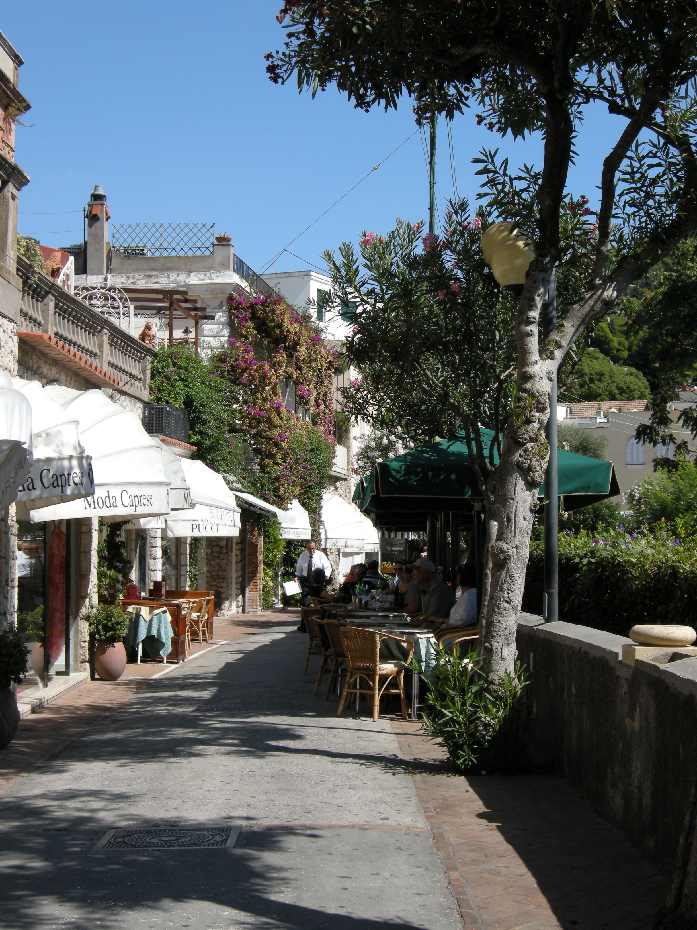 Första dagen låg vi vid poolen, vilade våra tunga ben. Åt mitt livs dyraste strutglass på kvällen i Sorrento, 5 euro. Men god var den. Dag två blev det utflykt till ön Capri. Ön där apotekarsonen från Småland, Axel Munthe bodde som blev livmedikus och en av Sveriges mest framgångsrika författare. Idag är ön en exklusiv pärla med hus ägda av stora framgångsrika personligheter. Här är det exklusiva märken som Armani, D&G mm som gäller och därmed är priserna höga. Capri är ändå väl bevarad och charmig och byn Anacapri har en fantastisk utsikt ut över havet.