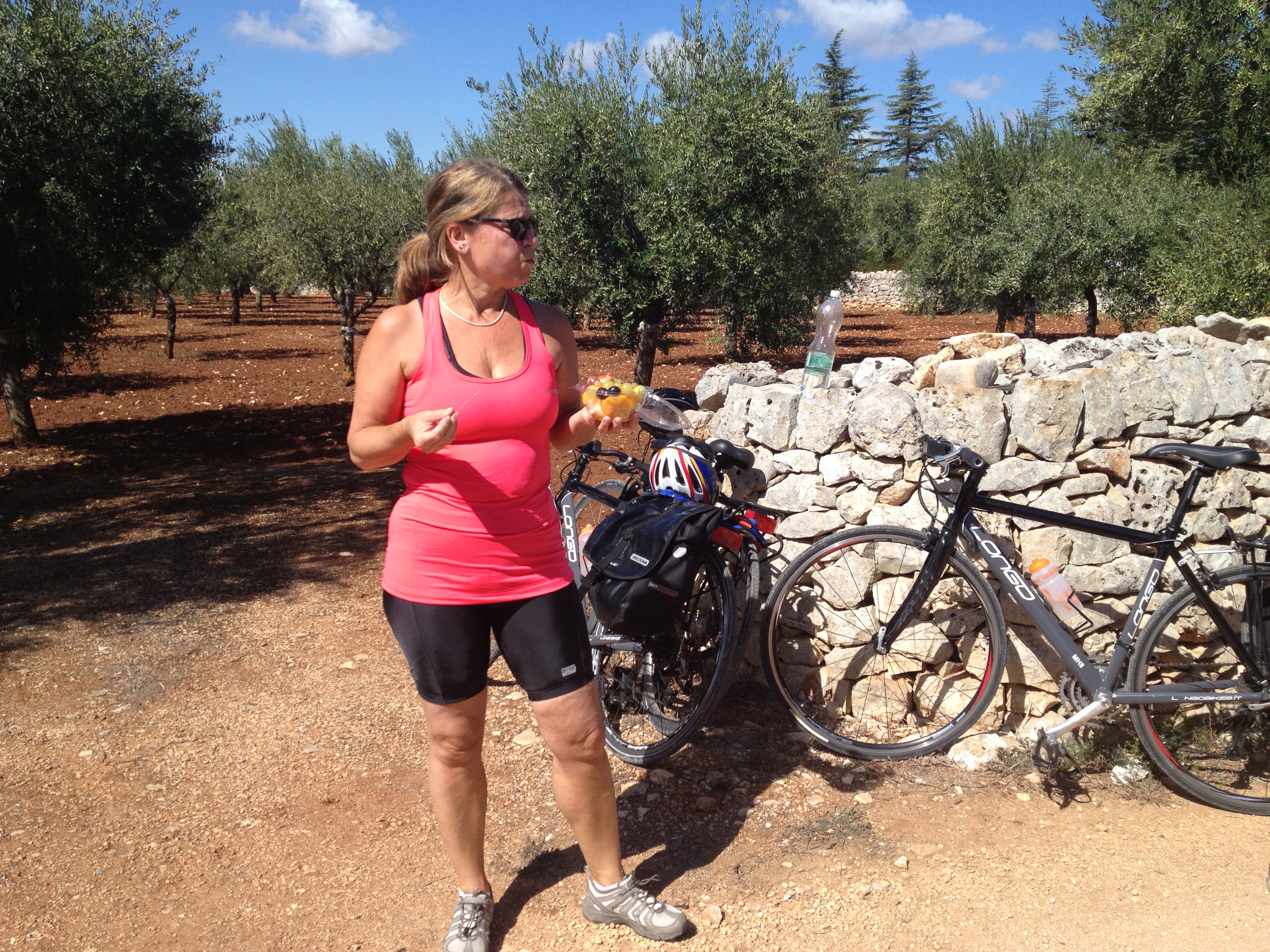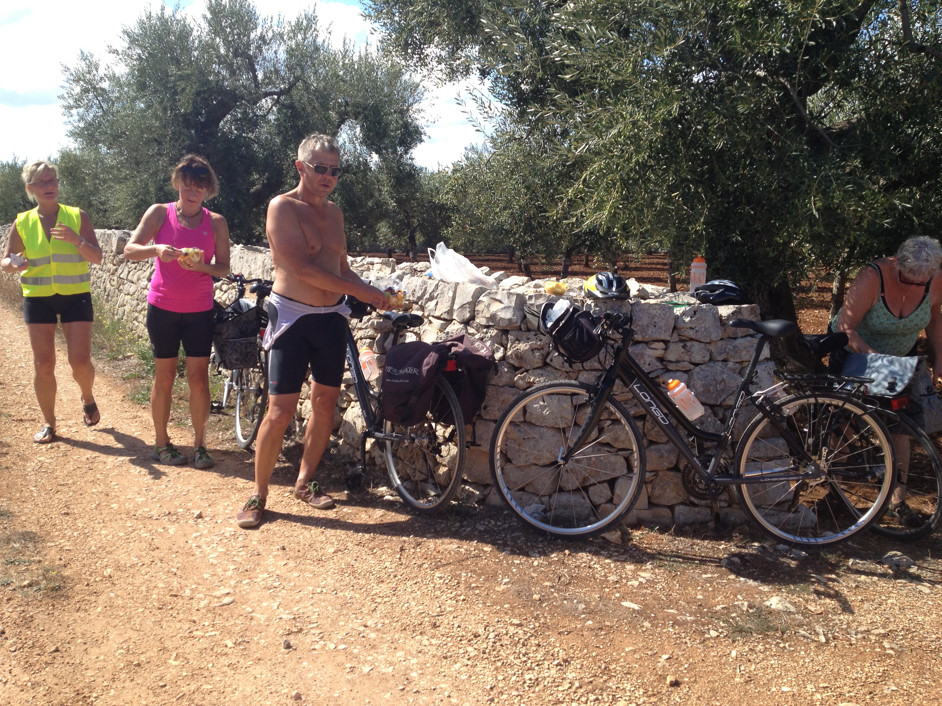 Vi startade redan 08.00 och dagens mål är byn Palinuro, en sträcka på ca 6 mil. Förmiddagen började med snällt stigande backar och vi kom ner till byn Acciaroli. Det var vacker och varierande natur hela vägen och trafiken mycket lugnare och behagligare än vid Amalfikusten. Efter Acciaroli tog vi av mot Ascea och då började stigningen uppför otroliga olivodlingar med träd som var så kraftiga och knotiga. Så stora olivträd har jag nog aldrig sett tidigare. Idag fick jag kliva av cykeln ofta p g a tunga ben men jag njöt utav otroligt vacker natur.