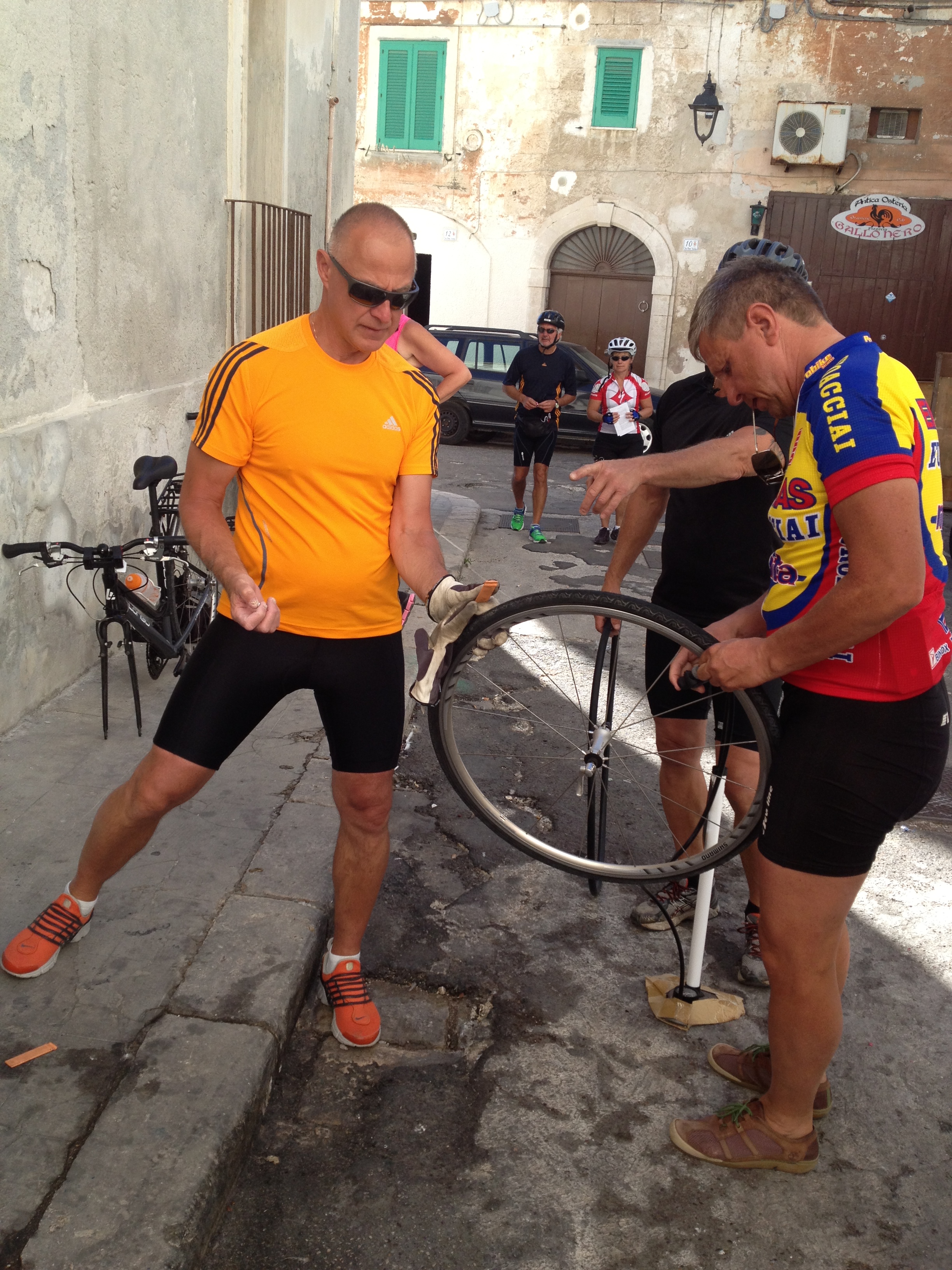 Under tiden vi fixade ihop cyklarna så uppmärksammade jag bussen som stod parkerad bredvid oss. Den gick till staden Latina som ligger ca 5 mil söder om Rom. Eftersom vi enligt vår ursprungliga plan skulle vara i närheten till Latina på tisdagen så skulle vi vinna tillbaka lite tid om vi tog bussen dit nu. Så blev det. Chauffören var så snäll att han bjöd på resan ner. I Latina skulle vi äntligen kunna cykla ut mot havet….. men vi kom inte långt då jag upptäckte att mitt framdrev var helt vint. Den hade fått sig en smäll vid flygtransporten. Genom att fråga oss fram hittade vi äntligen en cykelverkstad. Klockan var nu 13 och då var det dags för siesta. Vi var välkommen tillbaka till verkstaden kl 16. Det fick bli en lunch och några timmars läsning på en parkbänk.