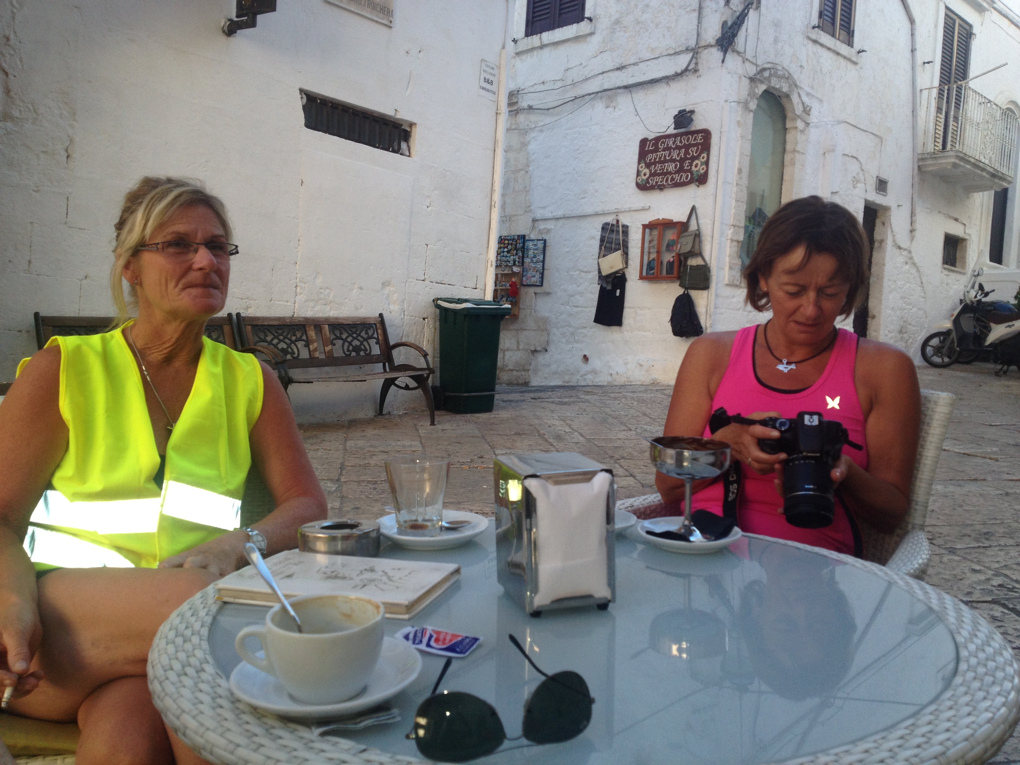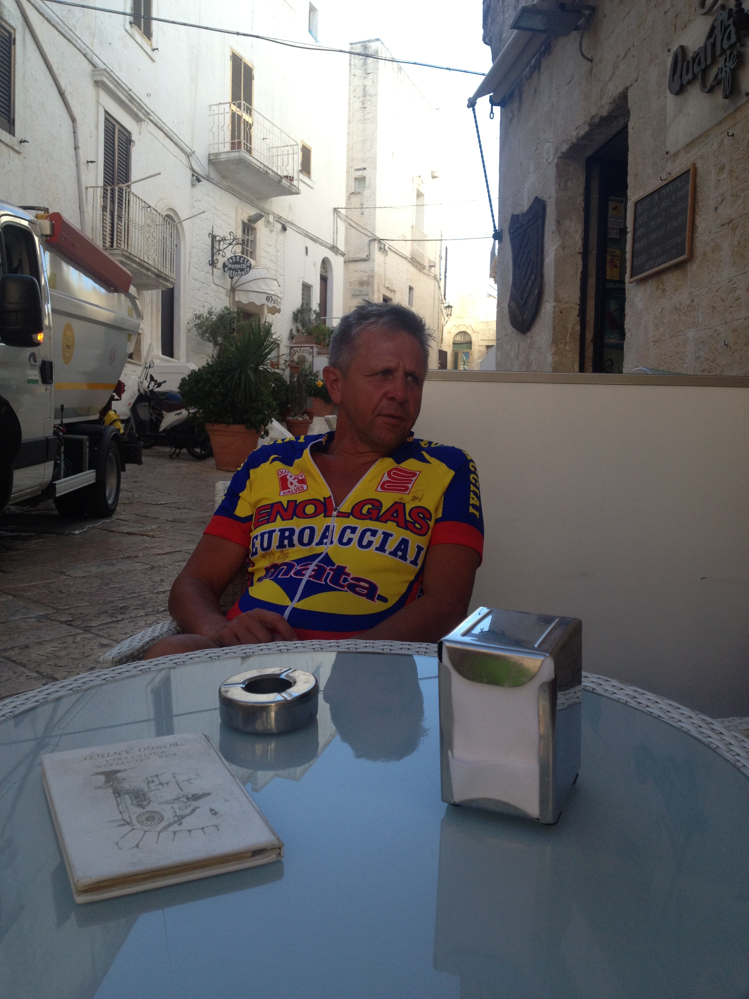 Hotellchefen där vi bodde bjöd på en härlig frukost med olika lokala ostar. Han ställde fram frukt, grönsaker och vi fick kaffe med varm mjölk. Mmmm…. Cykla nu mot Sapri. En genuin mysig stad där det blev en kafferast.